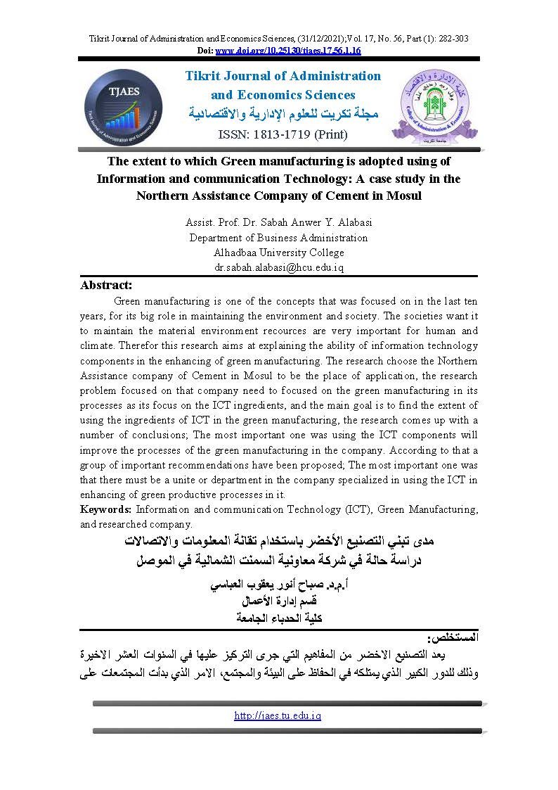 The extent to which Green man ufacturing is adopted using of Information and communication Technology: A case study in the Northern Assistance Company of Cement in MosulAbstract views : 0 | PDF downloads : 0Page No.: 282-303 |