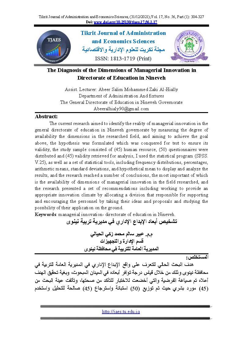 The Diagnosis of the Dimension s of Managerial Innovation in Directorate of Education in NinevehAbstract views : 0 | PDF downloads : 0Page No.: 304-327 |