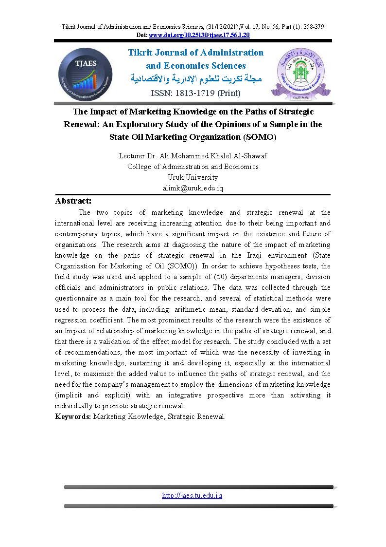 The Impact of Marketing Know ledge on the Paths of Strategic Renewal: An Exploratory Study of the Opinions of a Sample in the State Oil Marketing Organization (SOMO)Abstract views : 0 | PDF downloads : 0Page No.: 358-379 |