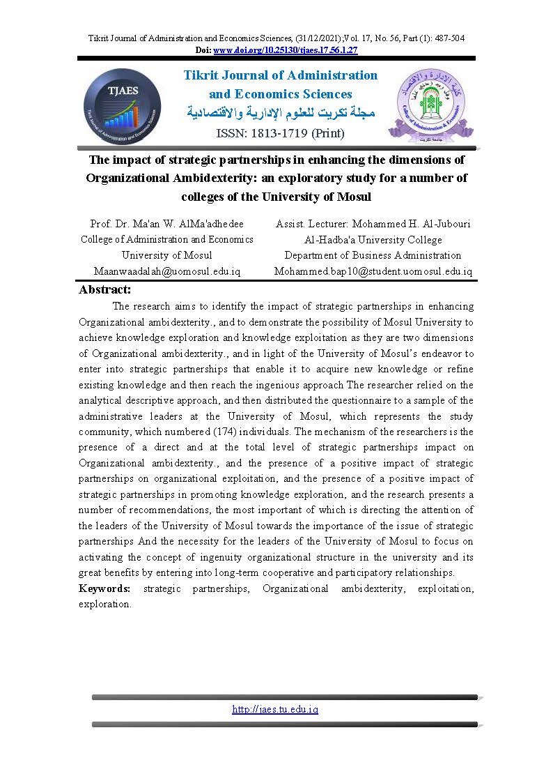 The impact of strategic partnershi ps in enhancing the dimensions of Organizational Ambidexterity: an exploratory study for a number of colleges of the University of MosulAbstract views : 0 | PDF downloads : 0Page No.: 487-504 |