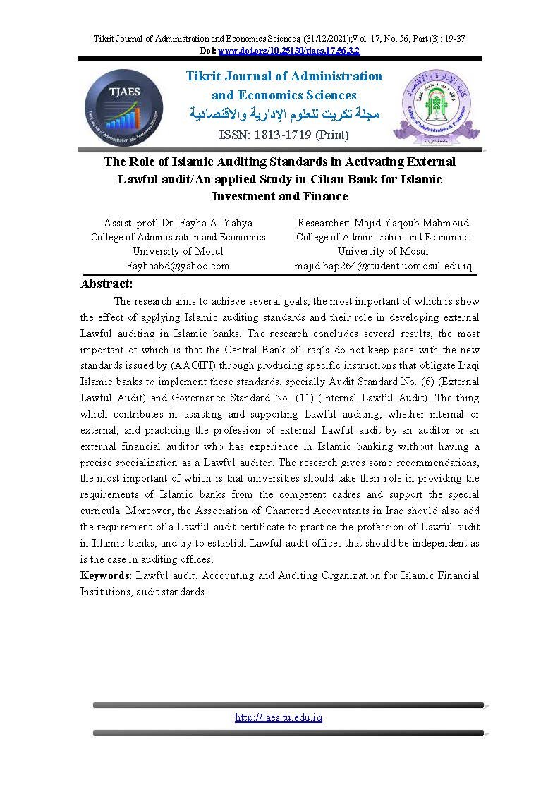 The Role of Islamic Auditing Standards in Activating External Lawful audit/An applied Study in Cihan Bank for Islamic Investment and FinanceAbstract views : 0 | PDF downloads : 0Page No.: 19-37 |