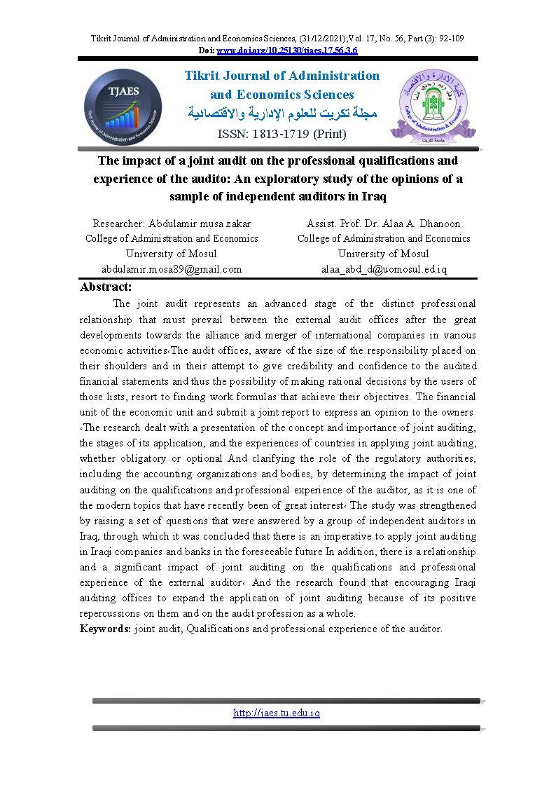 The impact of a joint audit on the professional qualifications and experience of the audito: An exploratory study of the opinions of a sample of independent auditors in IraqAbstract views : 0 | PDF downloads : 0Page No.: 92-109 |