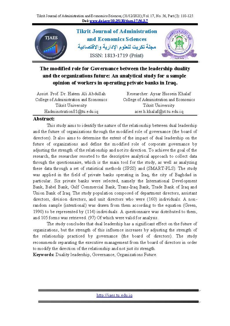 The modified role for Governance between the leadership duality and the organizations future: An analytical study for a sample opinion of workers in operating private banks in Iraq.Abstract views : 0 | PDF downloads : 0Page No.: 110-125 |