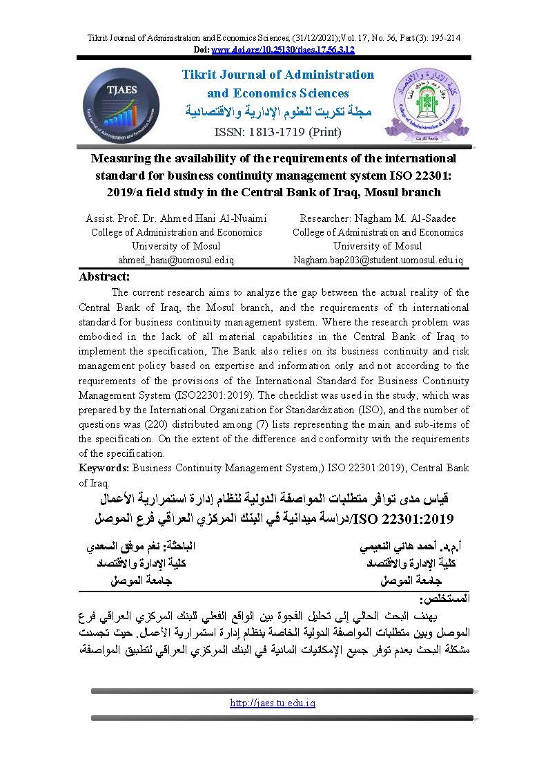 Measuring the availability of the requirements of the international standard for business continuity management system ISO 22301: 2019/a field study in the Central Bank of Iraq, Mosul branchAbstract views : 0 | PDF downloads : 0Page No.: 195-214 |