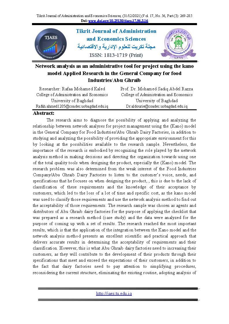 Network analysis as an administrative tool for project using the kano model Applied Research in the General Company for food Industries/Abu GhraibAbstract views : 0 | PDF downloads : 0Page No.: 269-285 |