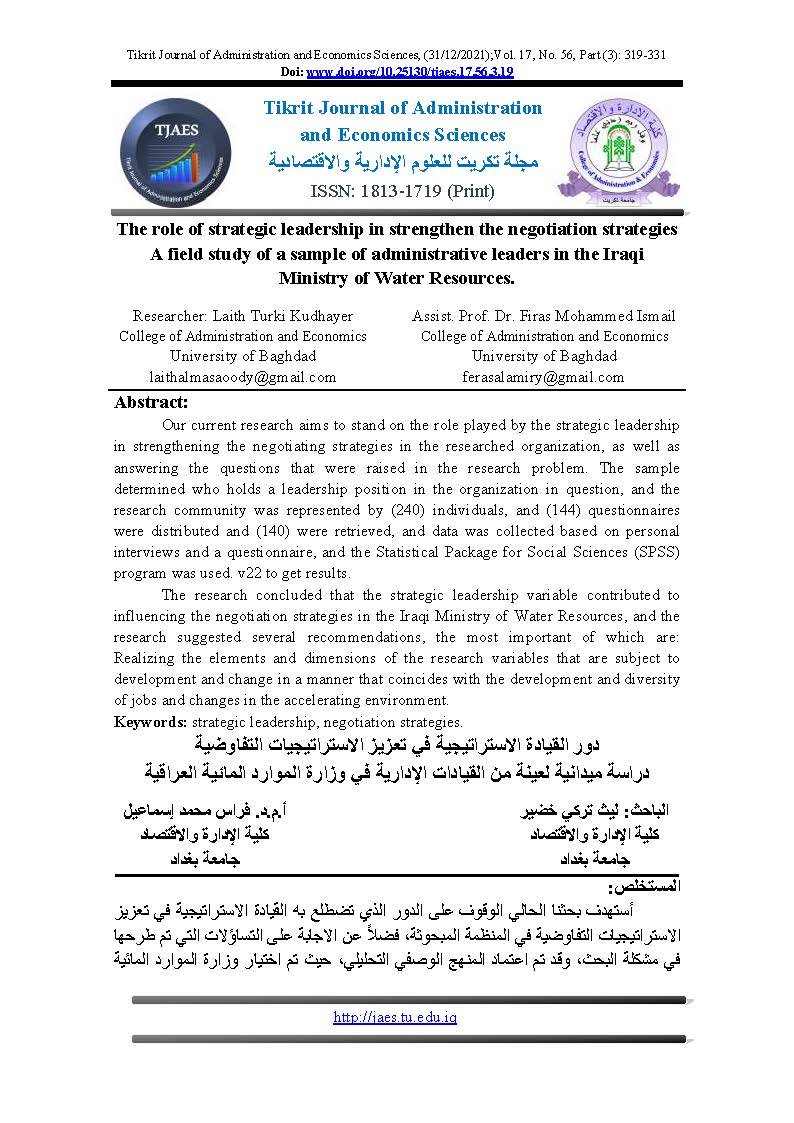 The role of strategic leadership in strengthen the negotiation strategies A field study of a sample of administrative leaders in the Iraqi Ministry of Water Resources.Abstract views : 0 | PDF downloads : 0Page No.: 319-331 |