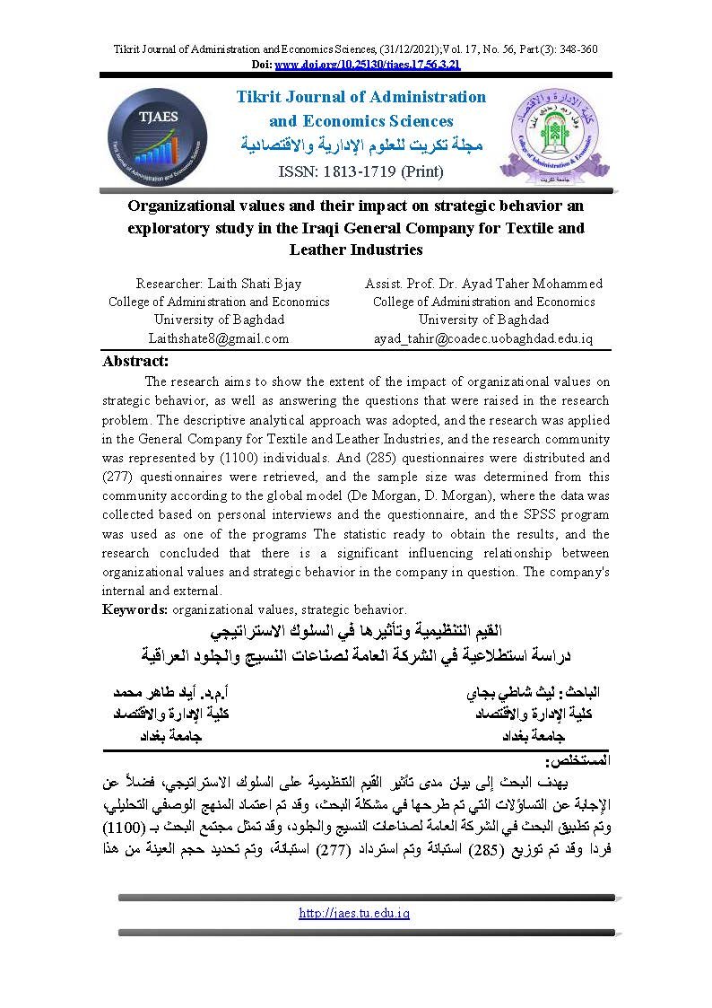 Organizational values and their impact on strategic behavior an exploratory study in the Iraqi General Company for Textile and Leather IndustriesAbstract views : 0 | PDF downloads : 0Page No.: 348-360 |