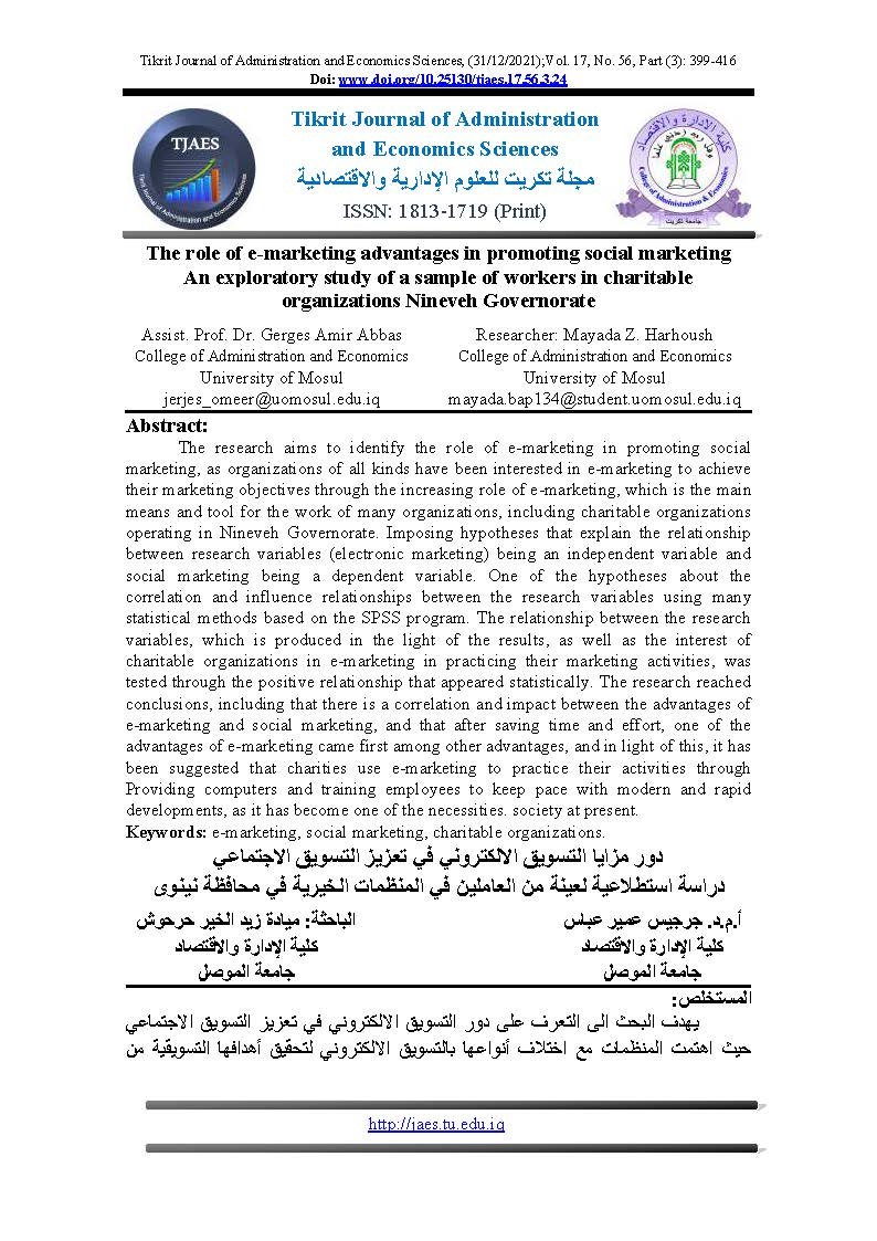 The role of e-marketing advantages in promoting social marketing An exploratory study of a sample of workers in charitable organizations Nineveh GovernorateAbstract views : 0 | PDF downloads : 0Page No.: 399-416 |