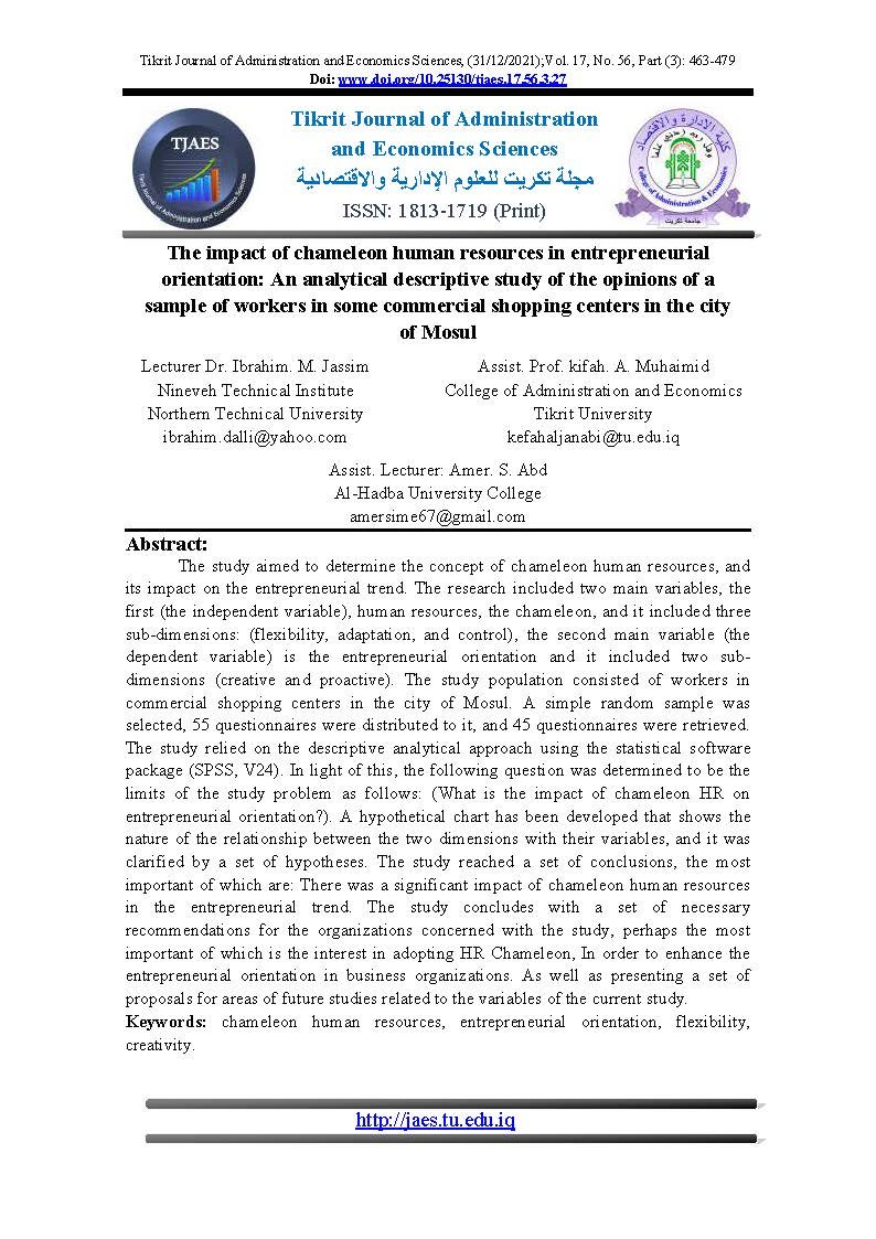 The impact of chameleon human resources in entrepreneurial orientation: An analytical descriptive study of the opinions of a sample of workers in some commercial shopping centers in the city of MosulAbstract views : 0 | PDF downloads : 0Page No.: 463-479 |