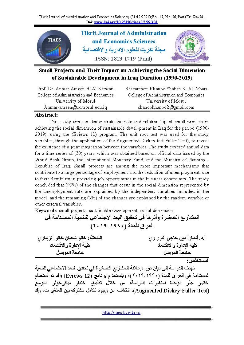 Small Projects and Their Impact on Achieving the Social Dimension of Sustainable Development in Iraq Duration (1990-2019)Abstract views : 0 | PDF downloads : 0Page No.: 524-541 |
