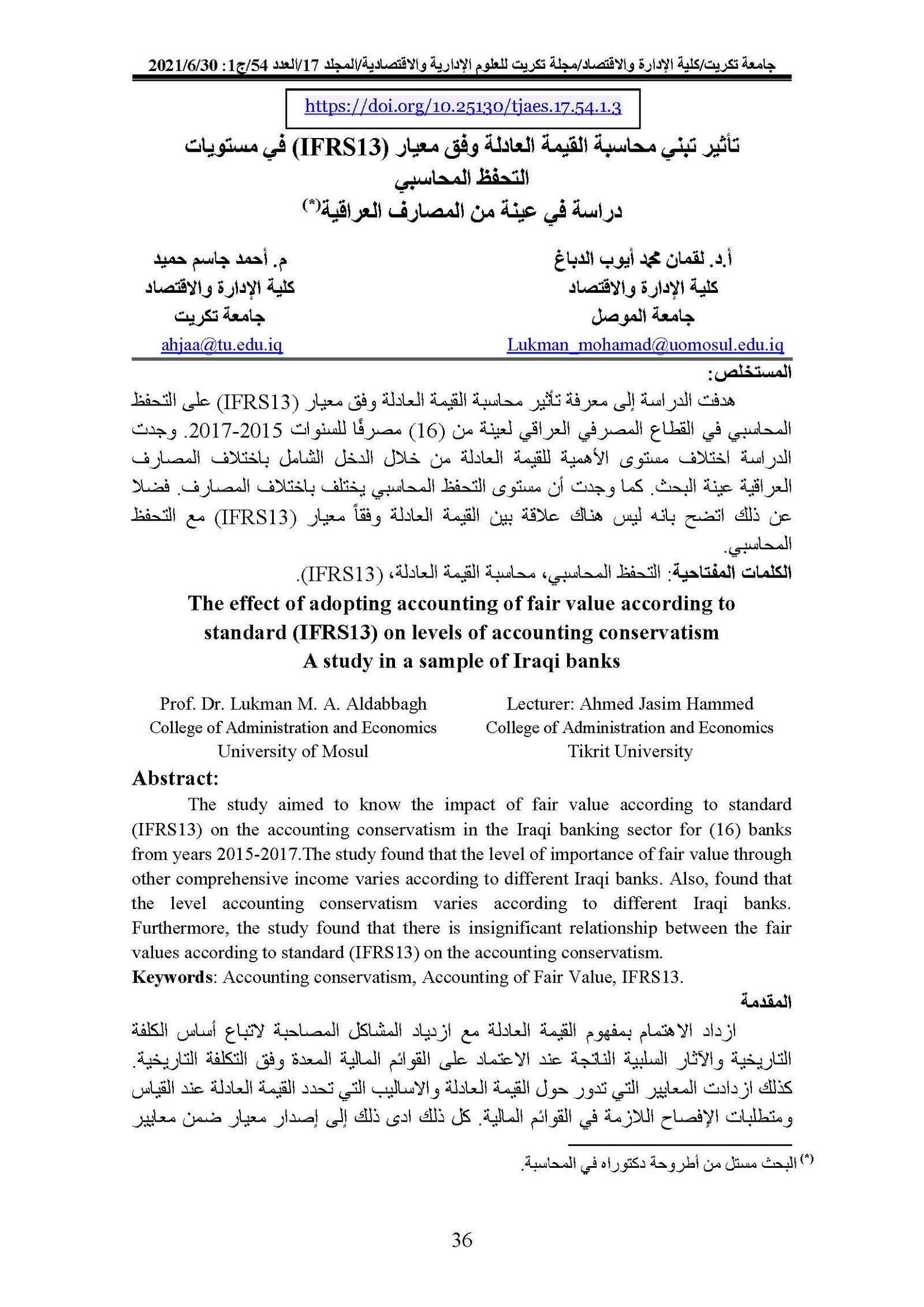 The effect of adopting accounting of fair value according to standard (IFRS13) on levels of accounting conservatism A study in a sample of Iraqi banksAbstract views : 0 | PDF downloads : 0Page No.: 36-50 |