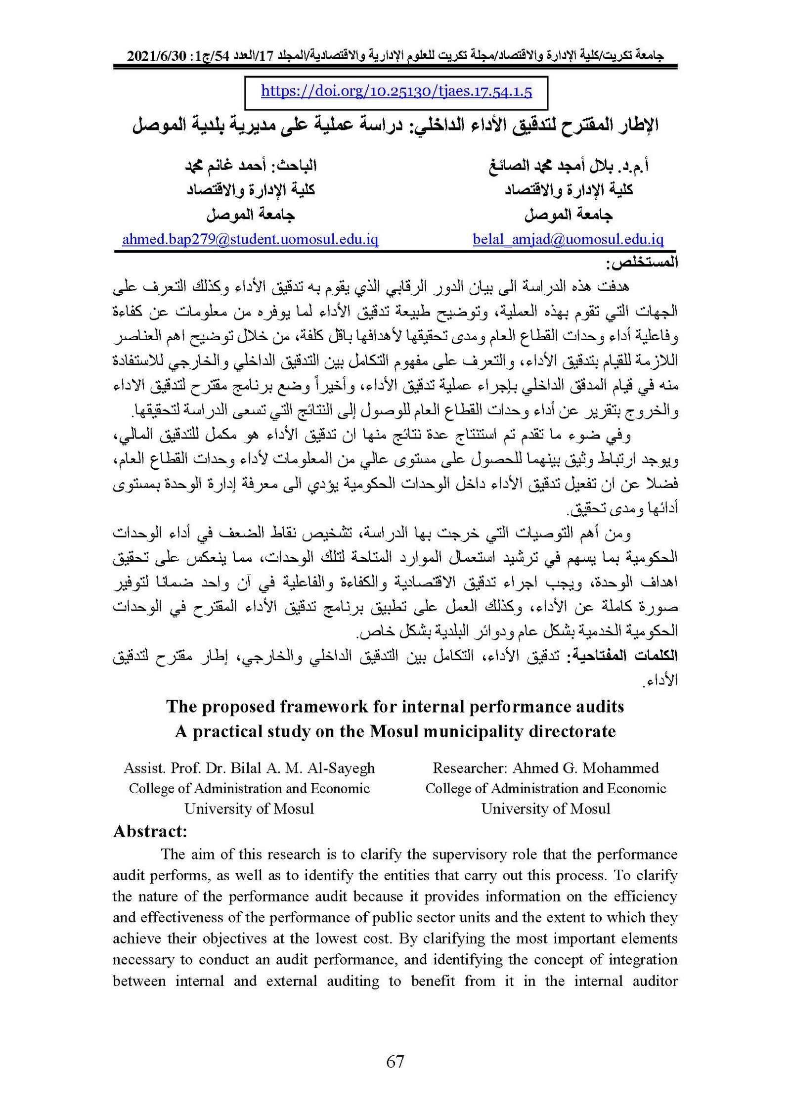 The proposed framework for internal performance audits A practical study on the Mosul municipality directorateAbstract views : 0 | PDF downloads : 0Page No.: 67-93 |