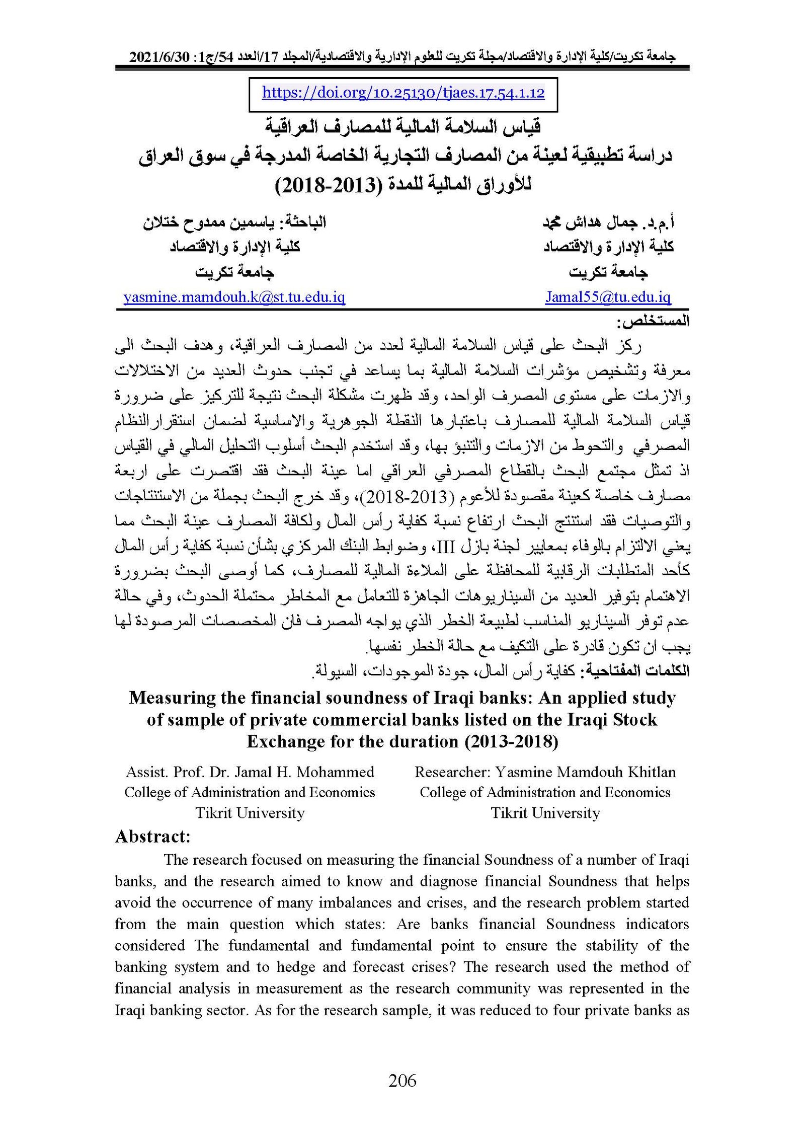 Measuring the financial soundness of Iraqi banks: An applied study of sample of private commercial banks listed on the Iraqi Stock Exchange for the duration (2013-2018)Abstract views : 0 | PDF downloads : 0Page No.: 206-217 |