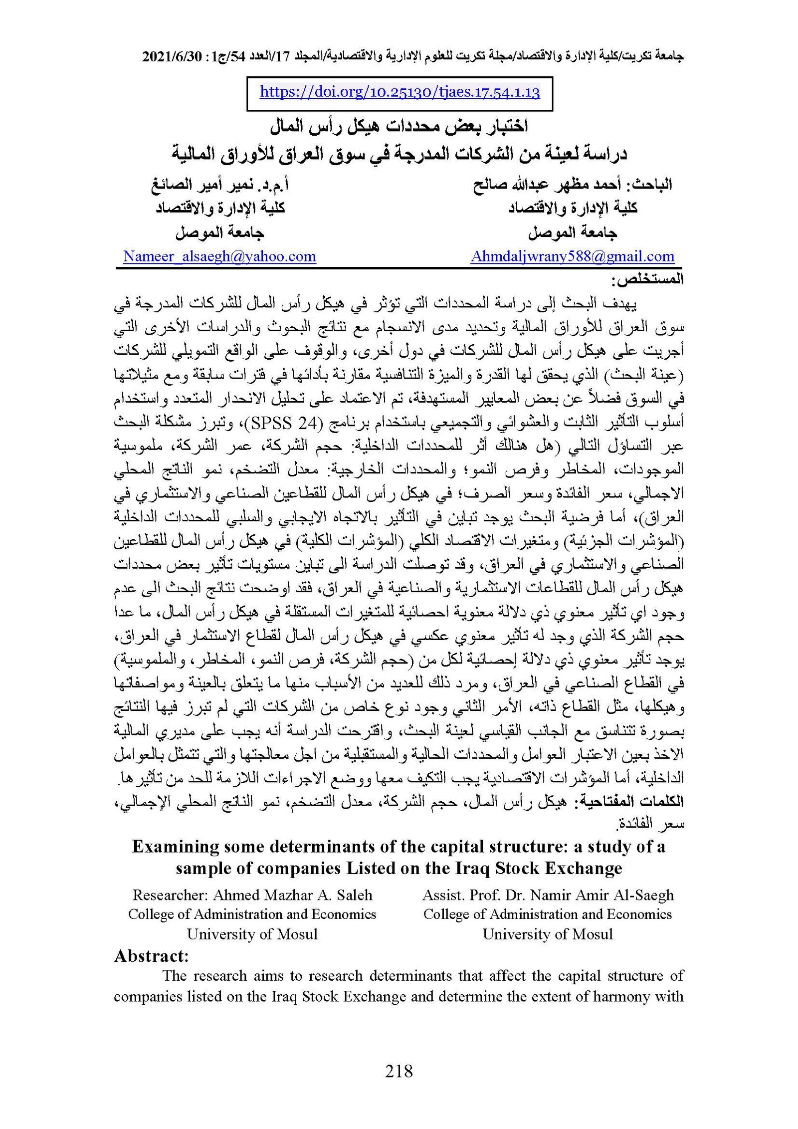 Examining some determinants of the capital structure: a study of a sample of companies Listed on the Iraq Stock ExchangeAbstract views : 0 | PDF downloads : 0Page No.: 218-230 |