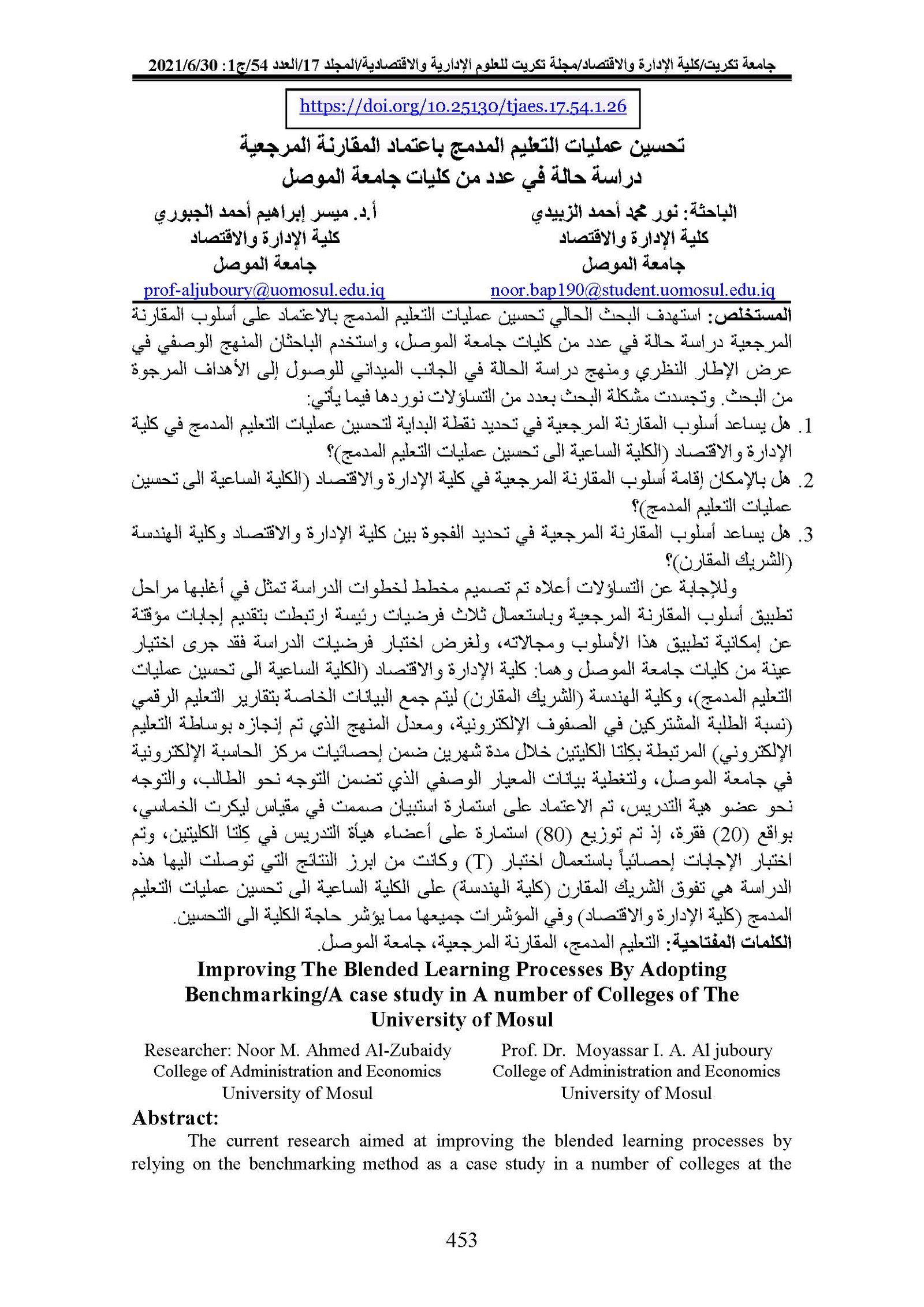 Improving The Blended Learning Processes By Adopting Benchmarking/A case study in A number of Colleges of The University of MosulAbstract views : 0 | PDF downloads : 0Page No.: 453-473 |