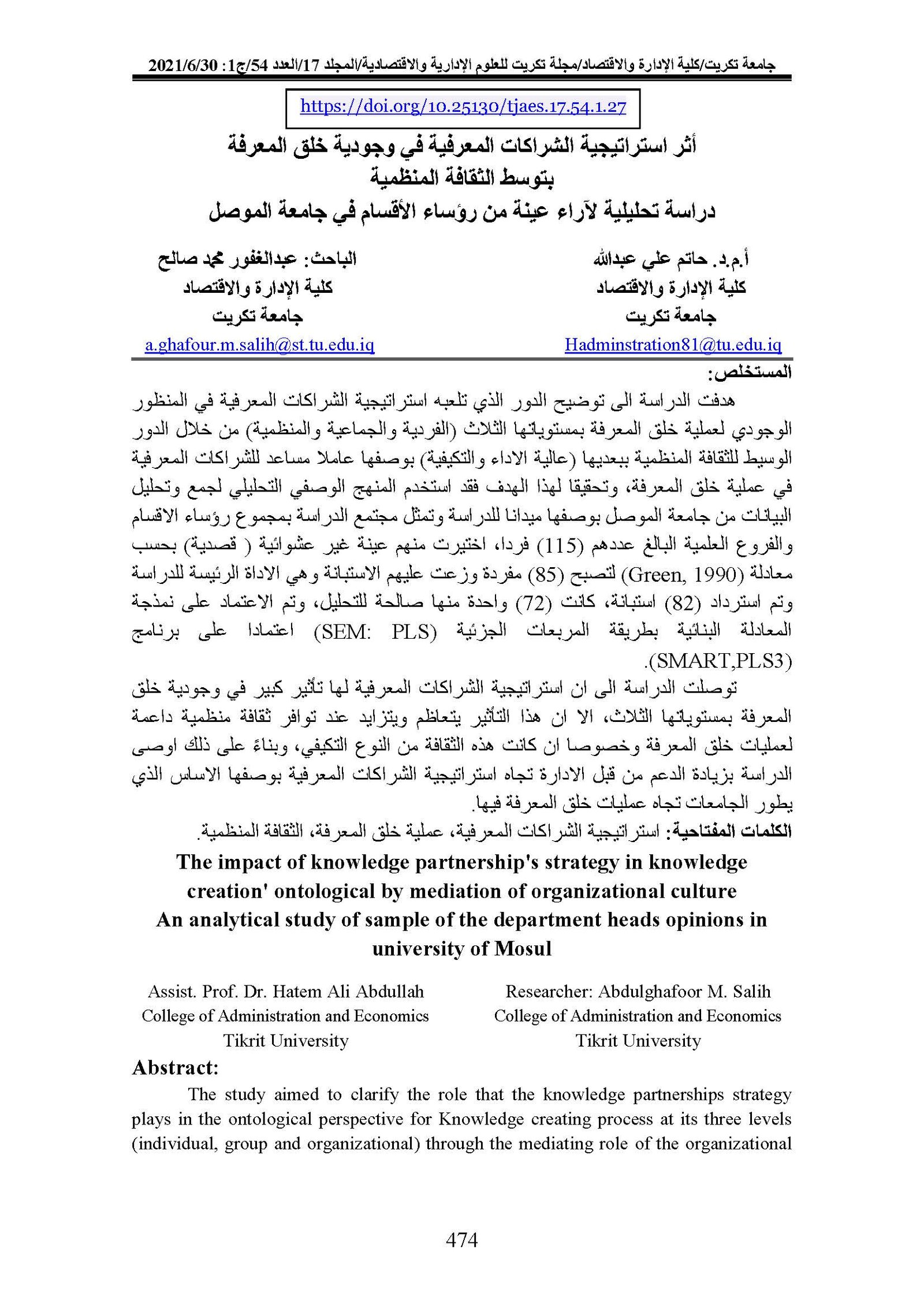 The impact of knowledge partnership's strategy in knowledge creation' ontological by mediation of organizational culture An analytical study of sample of the department heads opinions in university of MosulAbstract views : 0 | PDF downloads : 0Page No.: 474-493 |