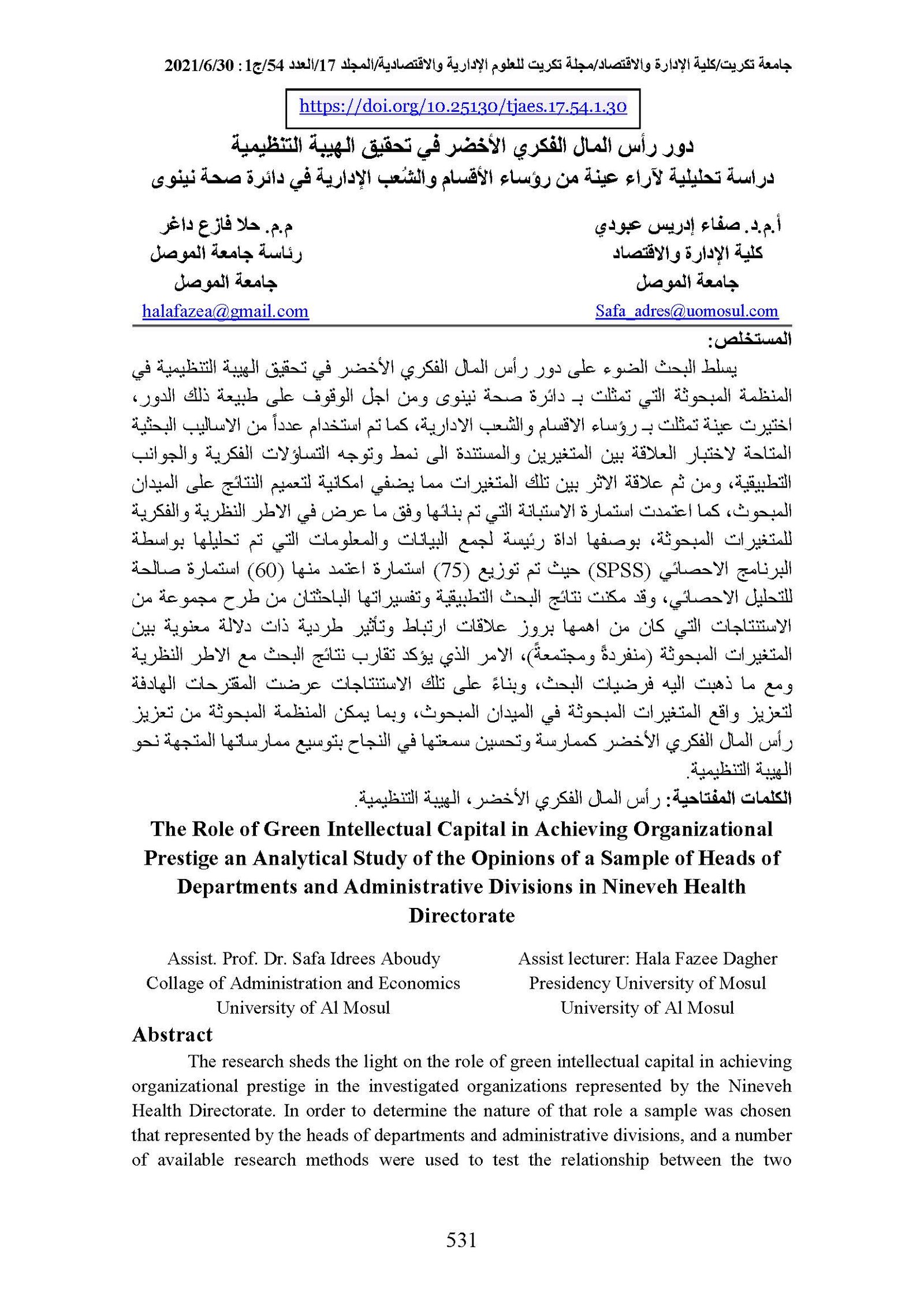 The Role of Green Intellectual Capital in Achieving Organizational Prestige an Analytical Study of the Opinions of a Sample of Heads of Departments and Administrative Divisions in Nineveh Health DirectorateAbstract views : 0 | PDF downloads : 0Page No.: 531-552 |