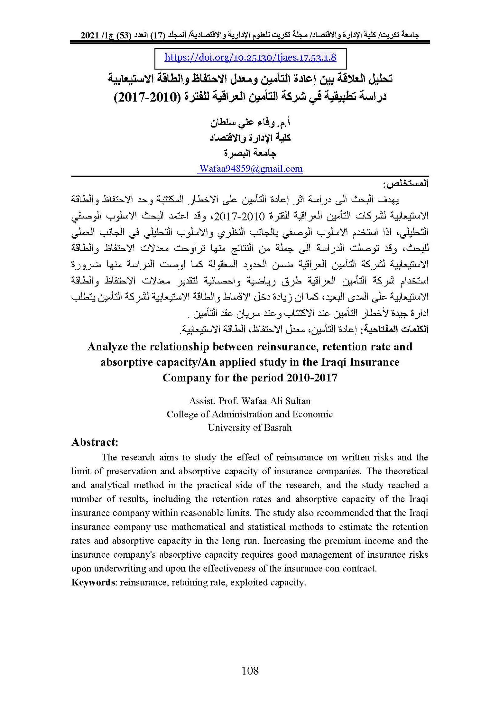 Analyze the relationship between reinsurance, retention rate and absorptive capacity/An applied study in the Iraqi Insurance Company for the period 2010-2017Abstract views : 0 | PDF downloads : 0Page No.: 108-127 |