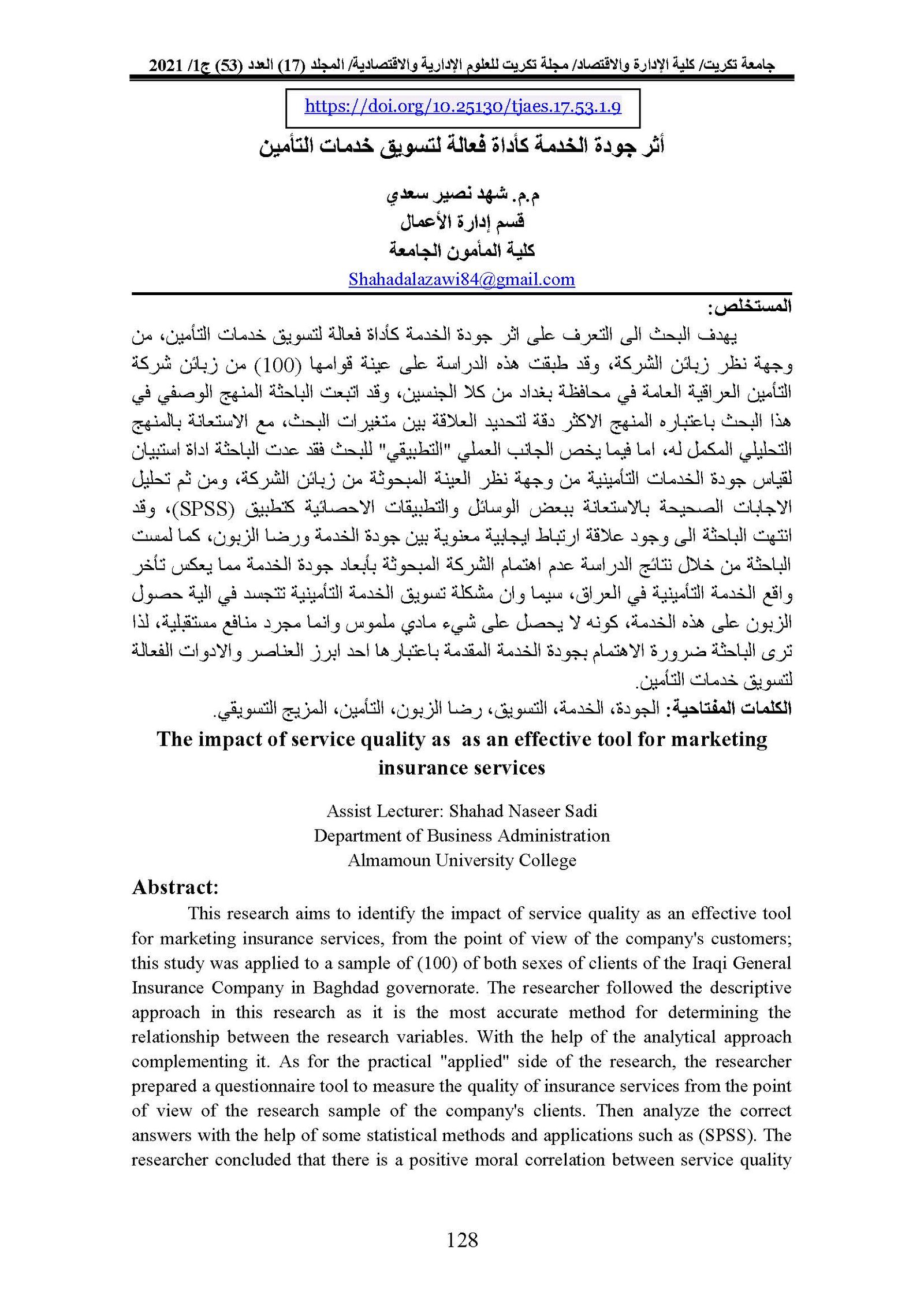 The impact of service quality as as an effective tool for marketing insurance servicesAbstract views : 0 | PDF downloads : 0Page No.: 128-141 |