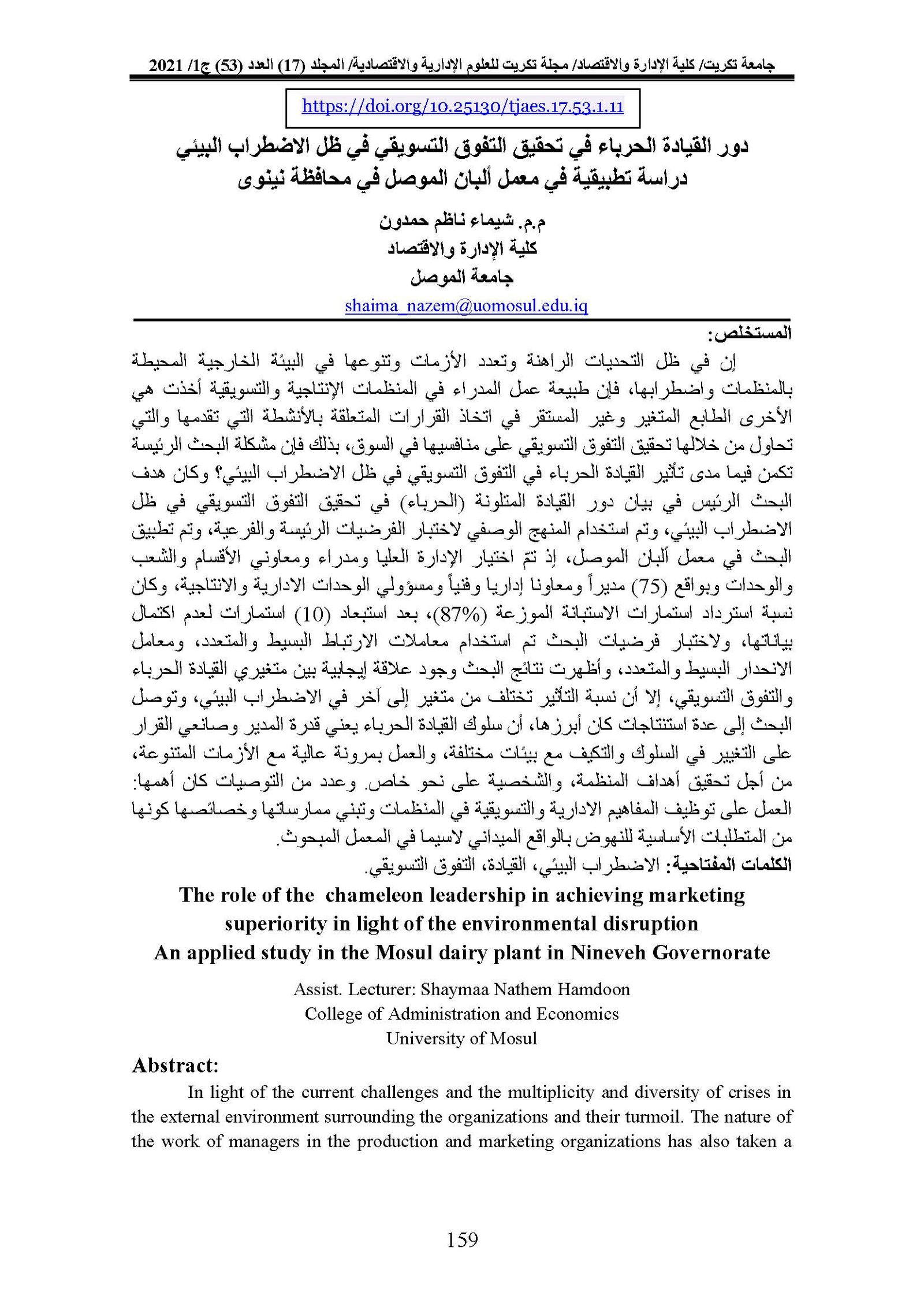 The role of the chameleon leadership in achieving marketing superiority in light of the environmental disruption An applied study in the Mosul dairy plant in Nineveh GovernorateAbstract views : 0 | PDF downloads : 0Page No.: 159-175 |