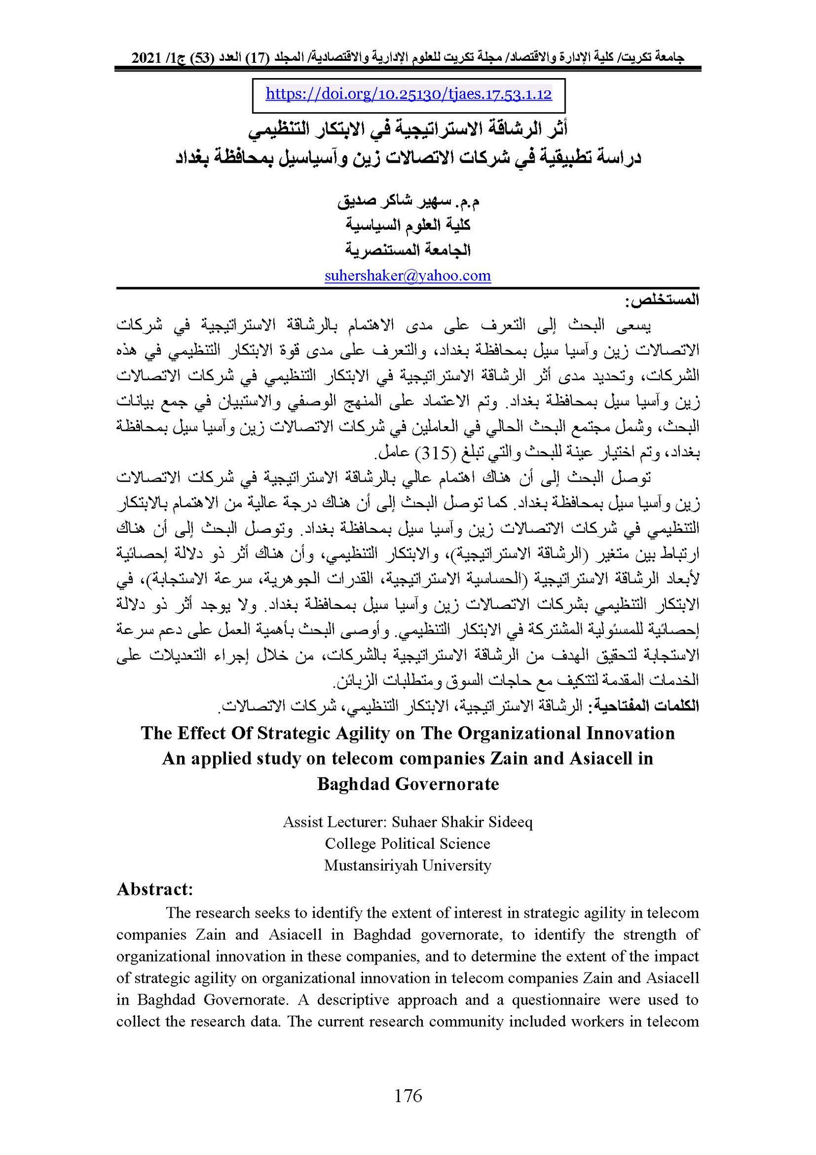 The Effect Of Strategic Agility on The Organizational Innovation An applied study on telecom companies Zain and Asiacell in Baghdad GovernorateAbstract views : 0 | PDF downloads : 0Page No.: 176-195 |