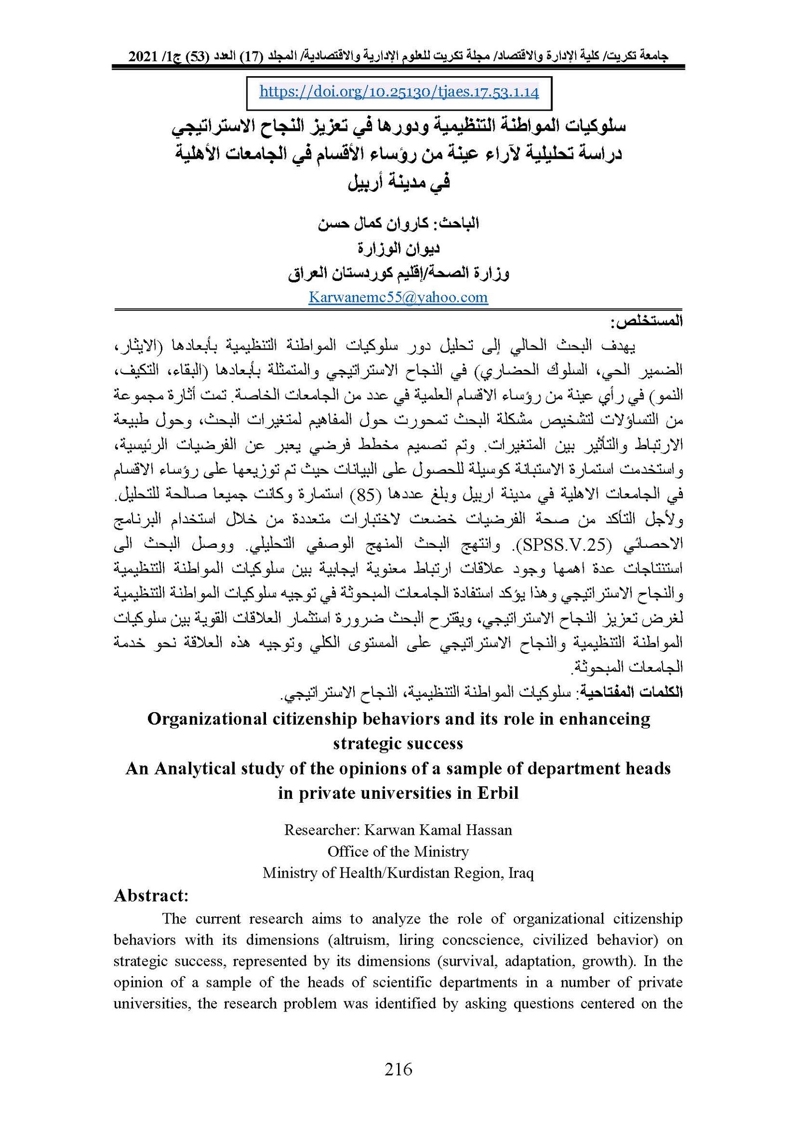 Organizational citizenship behaviors and its role in enhanceing strategic success An Analytical study of the opinions of a sample of department heads in private universities in ErbilAbstract views : 0 | PDF downloads : 0Page No.: 216-239 |
