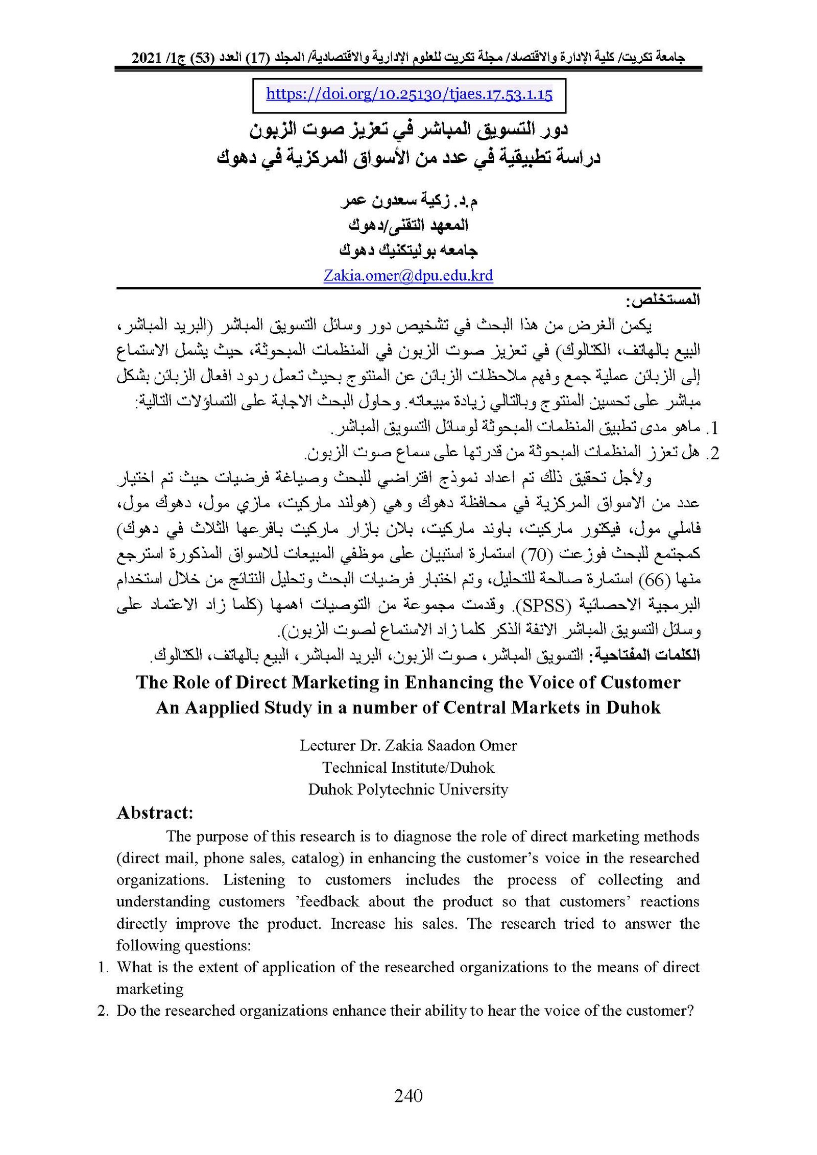 The Role of Direct Marketing in Enhancing the Voice of Customer An Aapplied Study in a number of Central Markets in DuhokAbstract views : 0 | PDF downloads : 0Page No.: 240-262 |