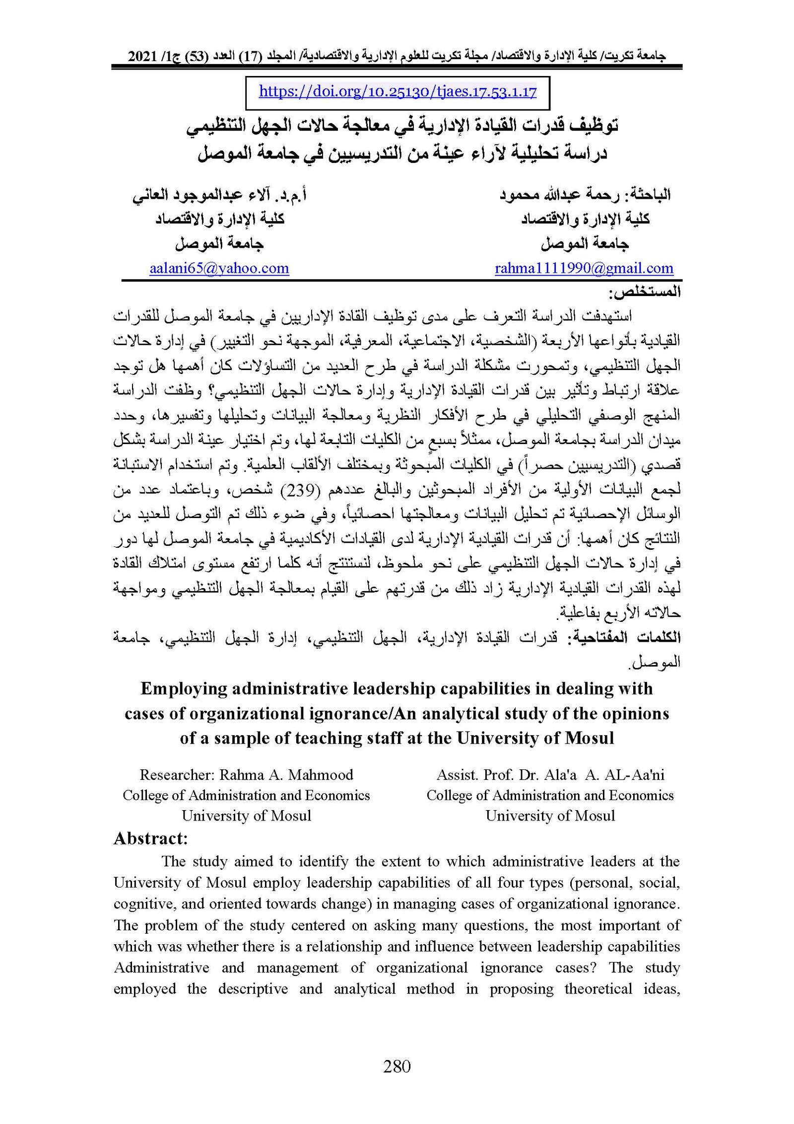 Employing administrative leadership capabilities in dealing with cases of organizational ignorance/An analytical study of the opinions of a sample of teaching staff at the University of MosulAbstract views : 0 | PDF downloads : 0Page No.: 280-300 |