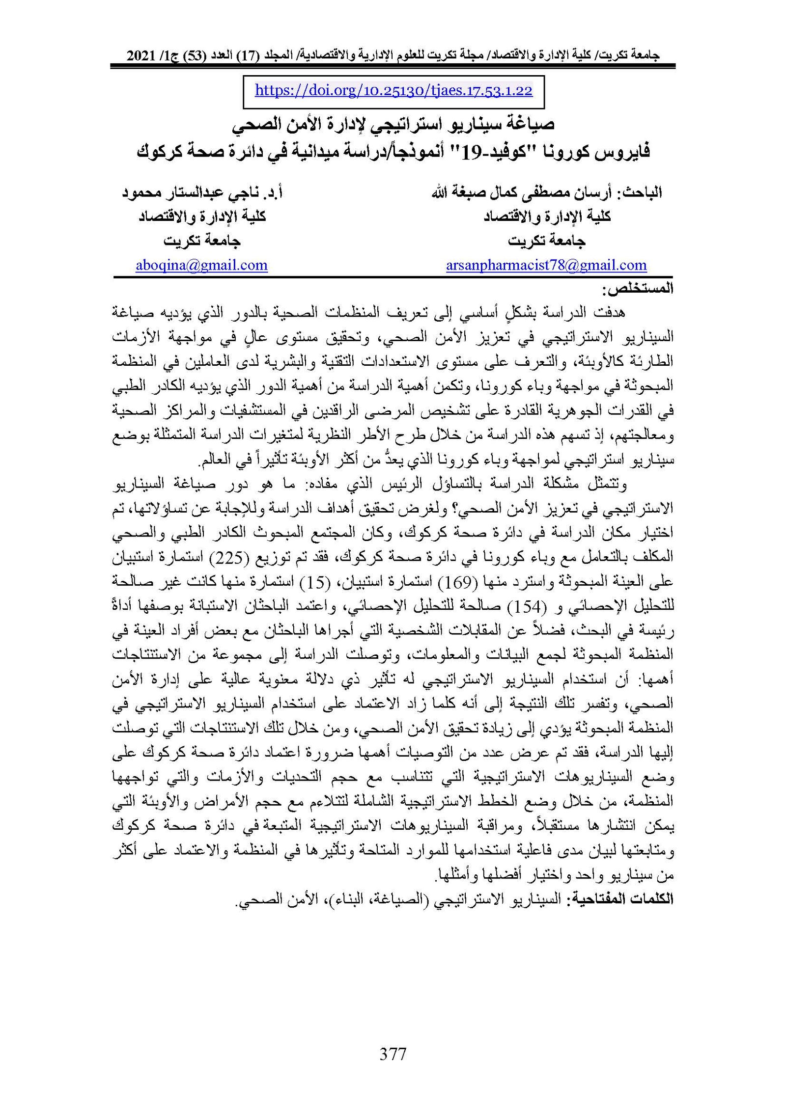 Formulating a Strategic Scenario for Health Security Management: Coronavirus 'Covid-19' Example/Field Study in Kirkuk Health DirectorAbstract views : 0 | PDF downloads : 0Page No.: 377-394 |