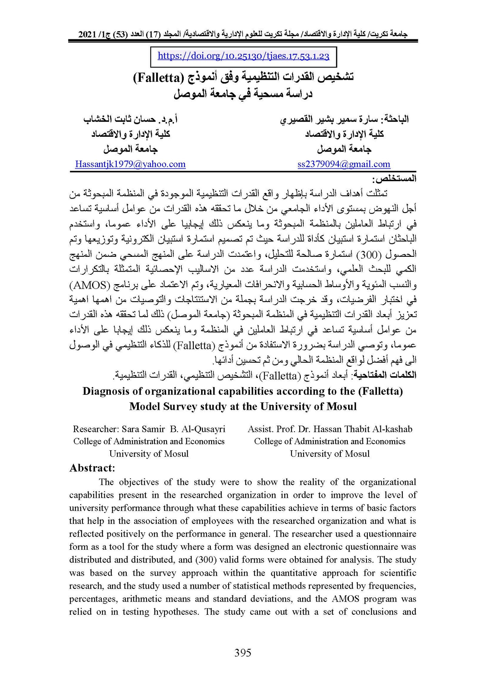 Diagnosis of organizational capabilities according to the (Falletta) Model Survey study at the University of MosulAbstract views : 0 | PDF downloads : 0Page No.: 395-414 |