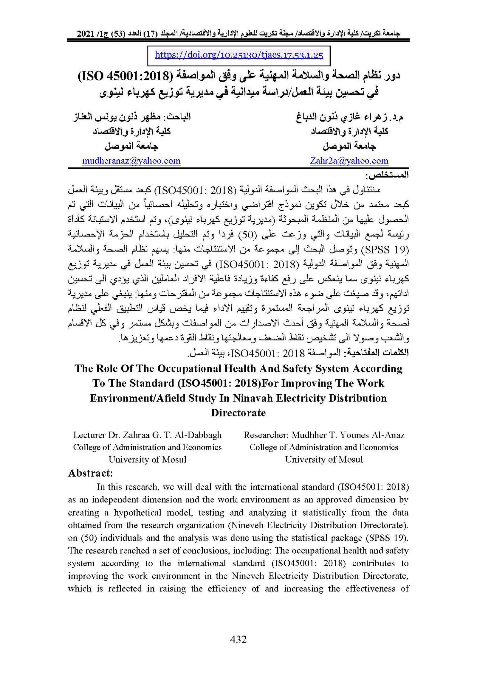 The Role Of The Occupational Health And Safety System According To The Standard (ISO45001: 2018)For Improving The Work Environment/Afield Study In Ninavah Electricity Distribution DirectorateAbstract views : 0 | PDF downloads : 0Page No.: 432-444 |