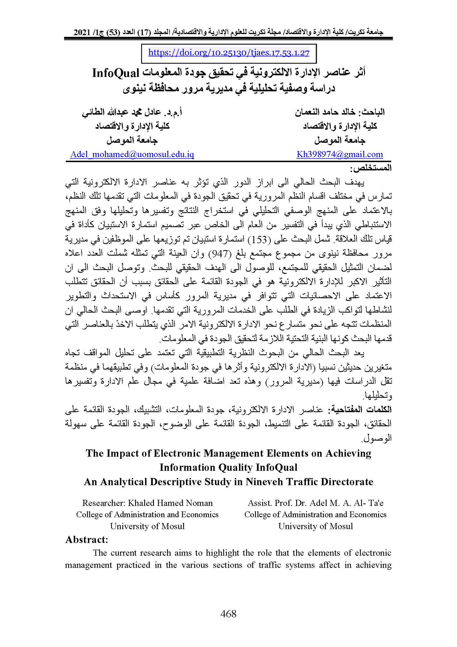 The Impact of Electronic Management Elements on Achieving Information Quality InfoQual An Analytical Descriptive Study in Nineveh Traffic DirectorateAbstract views : 0 | PDF downloads : 0Page No.: 468-485 |