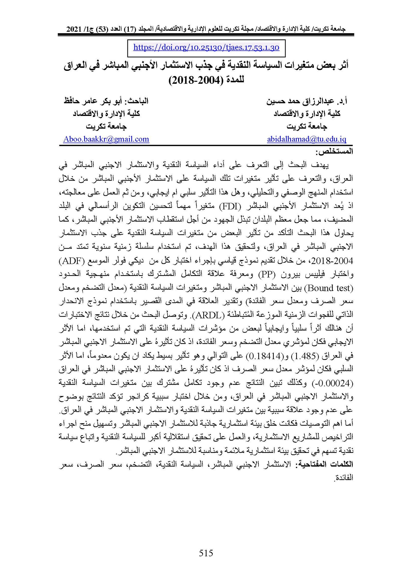 The effect of some monetary policy variables in attracting foreign direct investment in Iraq for the period (2004-2018)Abstract views : 0 | PDF downloads : 0Page No.: 515-531 |