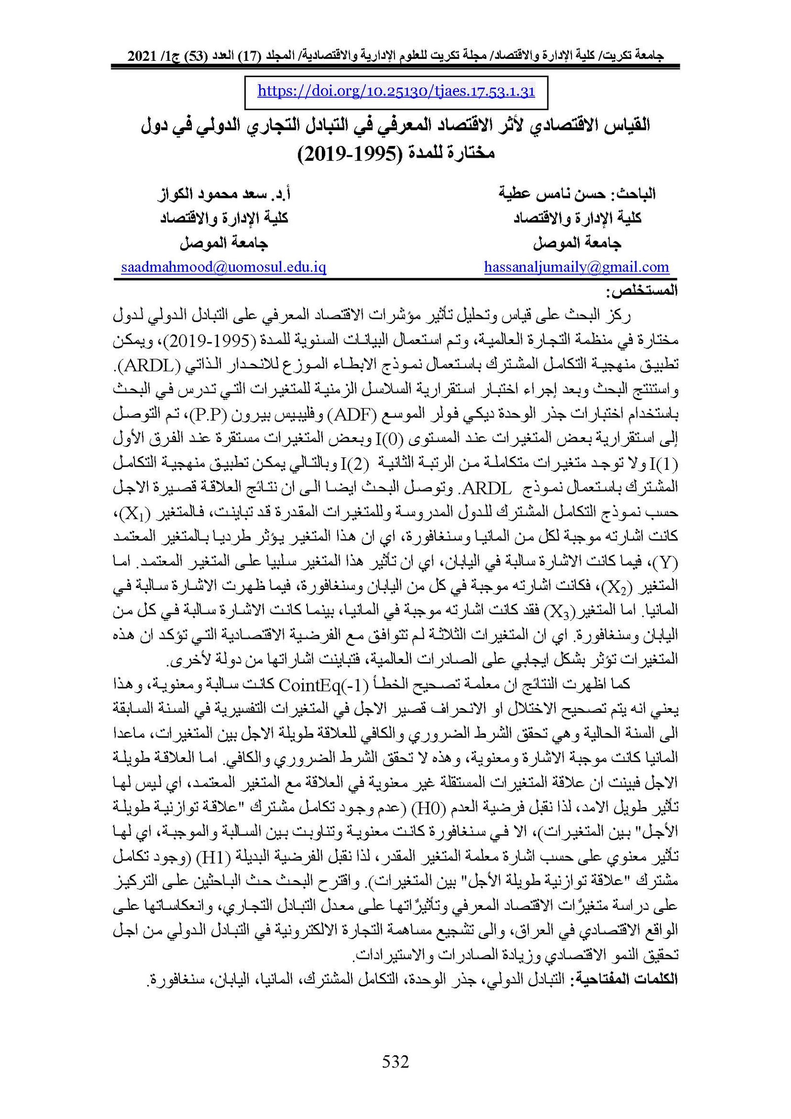 Economic measurement of the impact of the knowledge economy on international trade exchange in selected countries for the period (1995-2019)Abstract views : 0 | PDF downloads : 0Page No.: 532-560 |