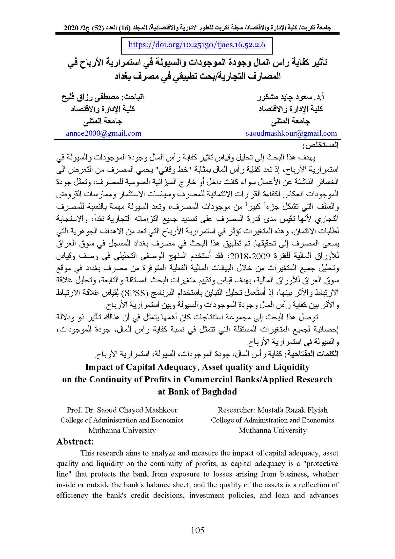 Impact of Capital Adequacy, Asset quality and Liquidity on the Continuity of Profits in Commercial Banks/Applied Research at Bank of BaghdadAbstract views : 0 | PDF downloads : 0Page No.: 105-122 |