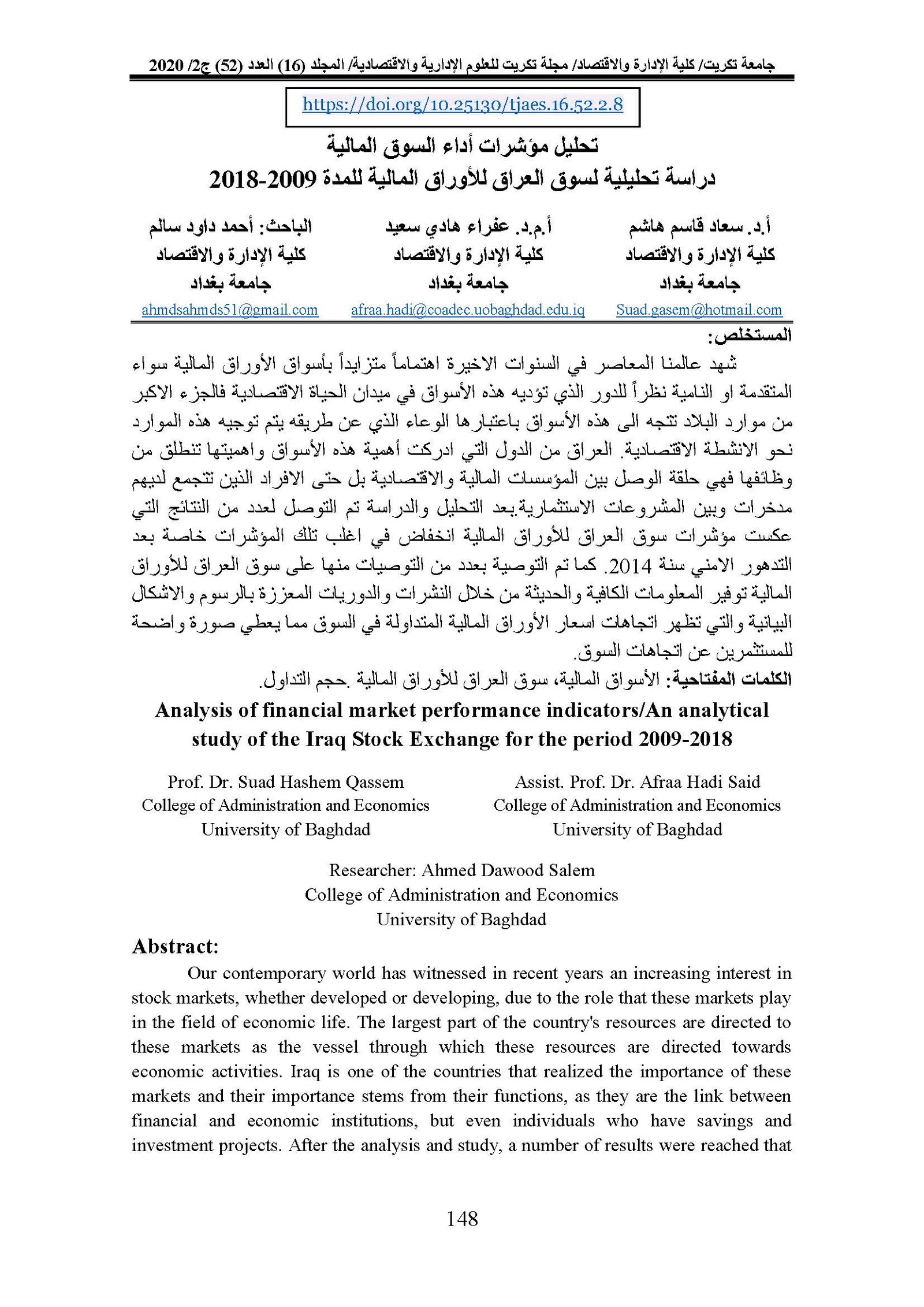 Analysis of financial market performance indicators/An analytical study of the Iraq Stock Exchange for the period 2009-2018Abstract views : 0 | PDF downloads : 0Page No.: 148-163 |