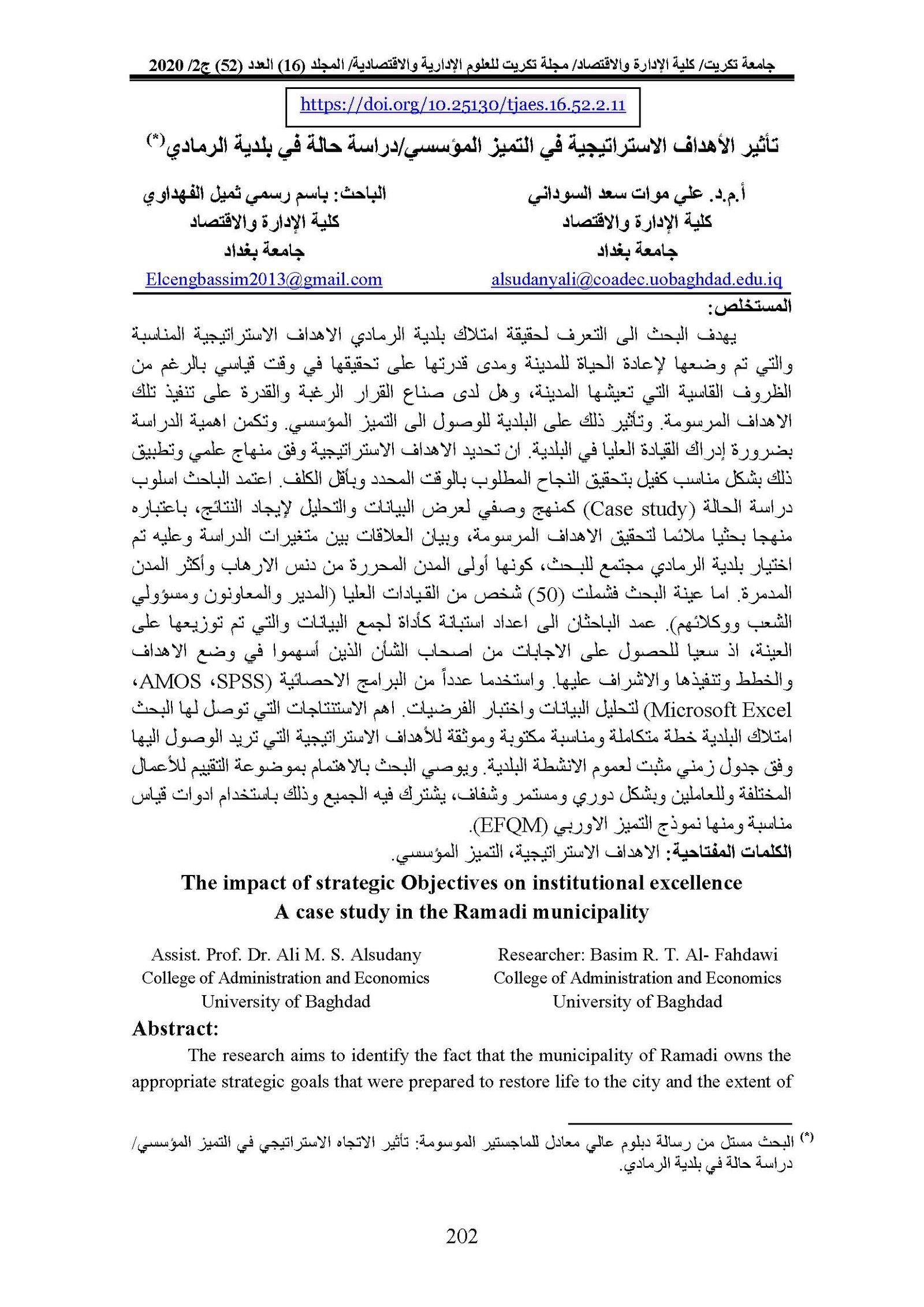 The impact of strategic Objectives on institutional excellence A case study in the Ramadi municipalityAbstract views : 0 | PDF downloads : 0Page No.: 202-217 |