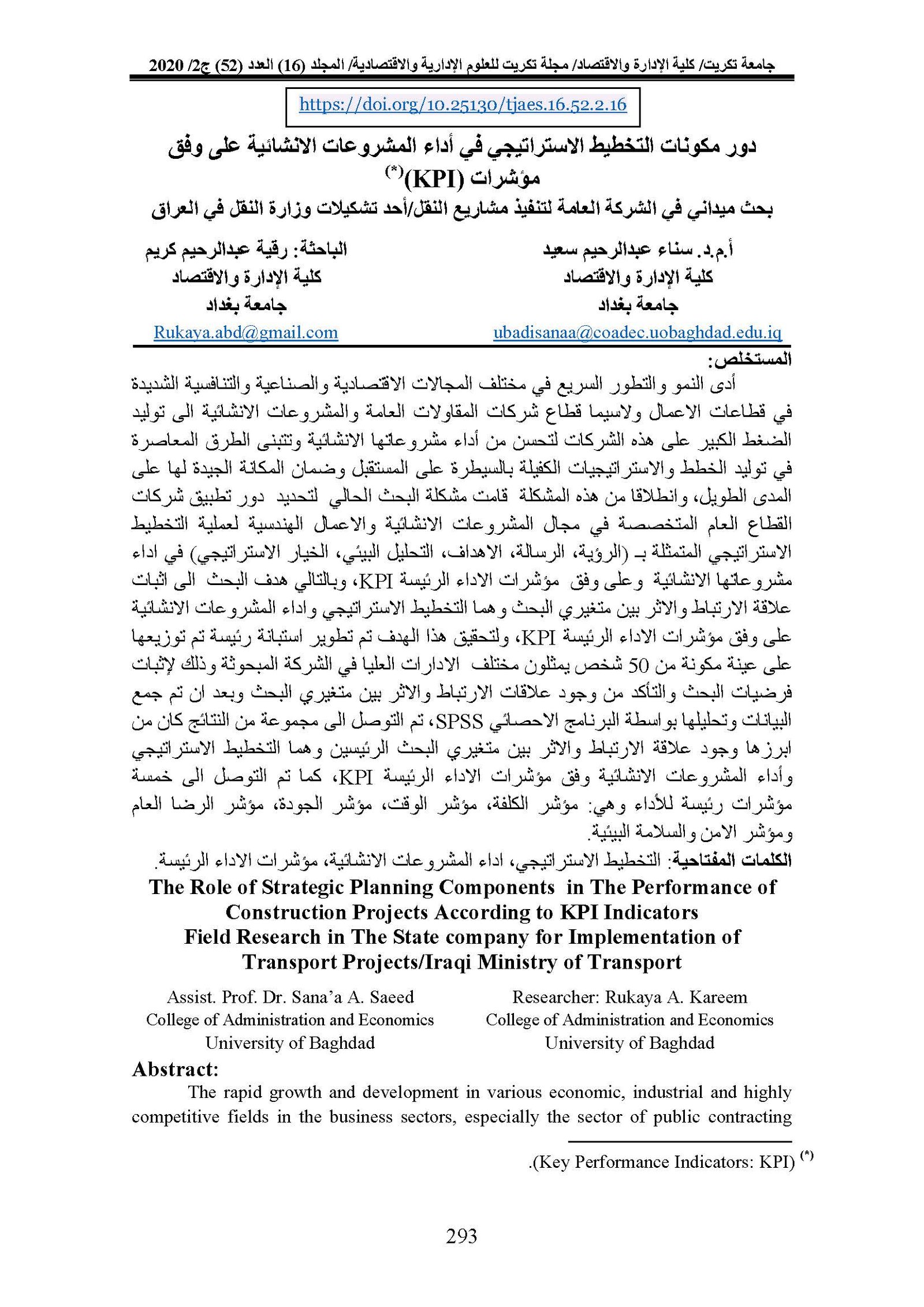 The Role of Strategic Planning Components in The Performance of Construction Projects According to KPI Indicators Field Research in The State company for Implementation of Transport Projects/Iraqi Ministry of TransportAbstract views : 0 | PDF downloads : 0Page No.: 293-311 |