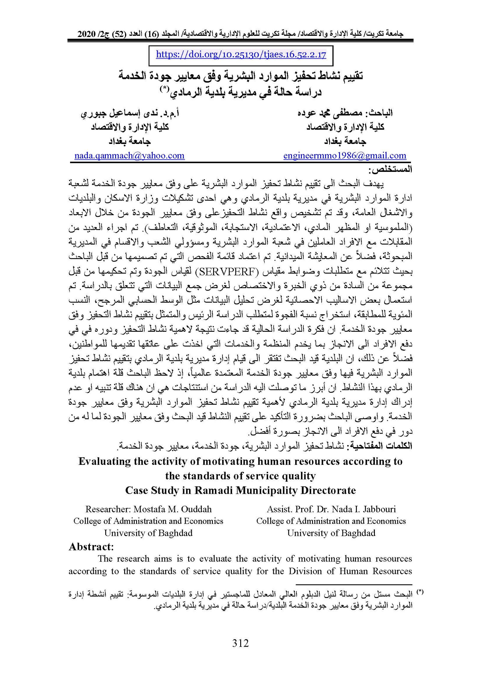 Evaluating the activity of motivating human resources according to the standards of service quality Case Study in Ramadi Municipality DirectorateAbstract views : 0 | PDF downloads : 0Page No.: 312-329 |