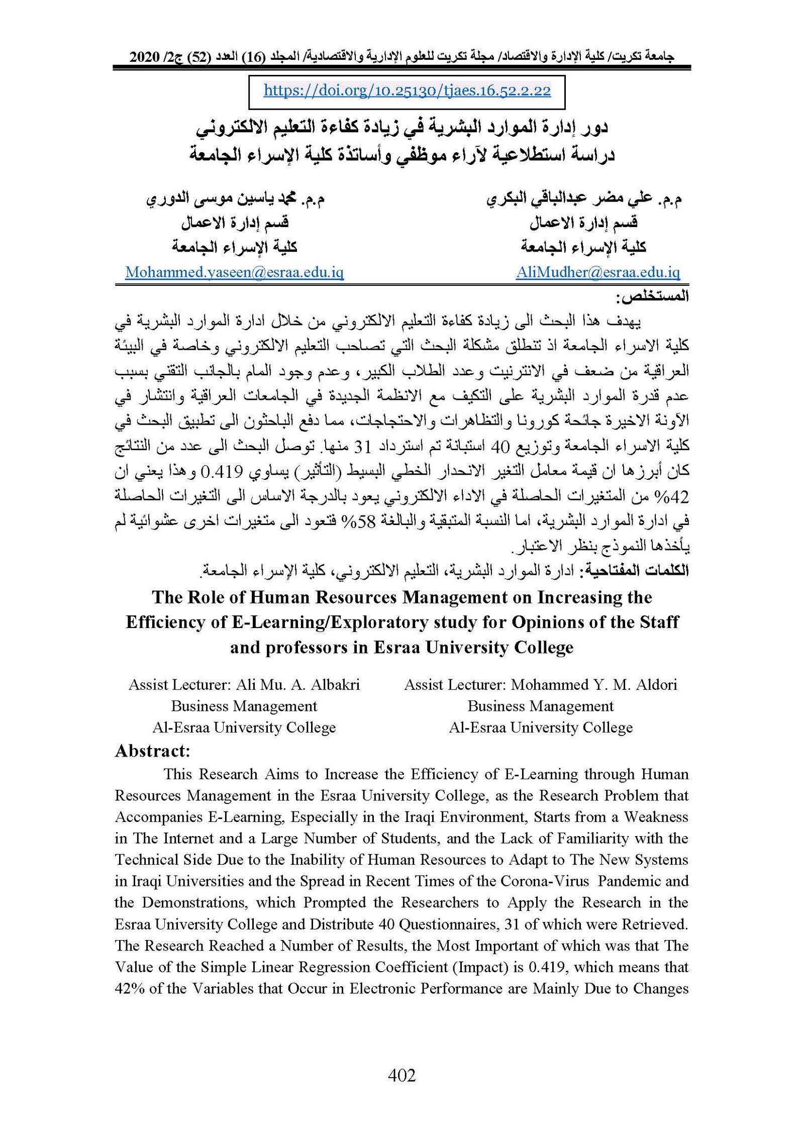 The Role of Human Resources Management on Increasing the Efficiency of E-Learning/Exploratory study for Opinions of the Staff and professors in Esraa University CollegeAbstract views : 0 | PDF downloads : 0Page No.: 402-413 |