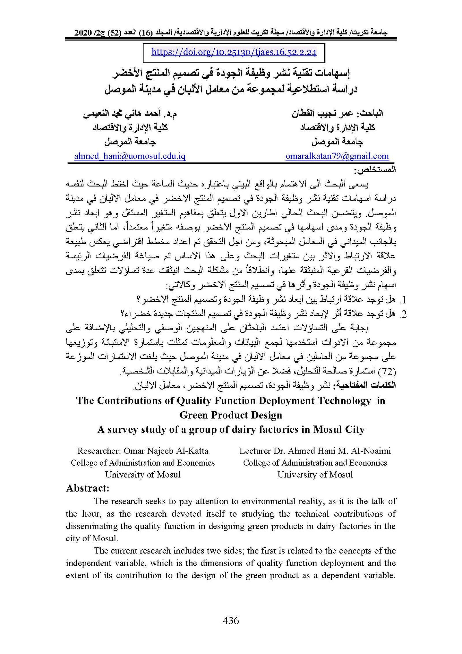 The Contributions of Quality Function Deployment Technology in Green Product Design A survey study of a group of dairy factories in Mosul CityAbstract views : 0 | PDF downloads : 0Page No.: 436-454 |