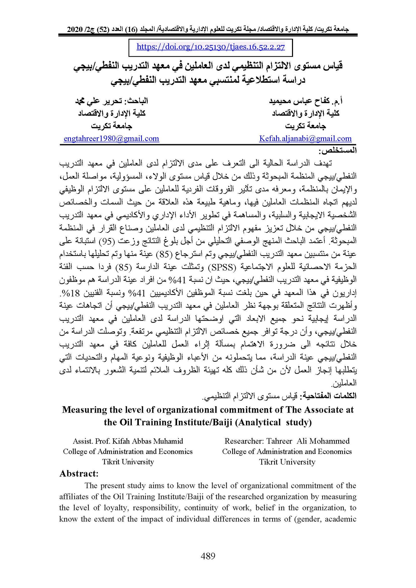 Measuring the level of organizational commitment of The Associate at the Oil Training Institute/Baiji (Analytical study)Abstract views : 0 | PDF downloads : 0Page No.: 489-503 |