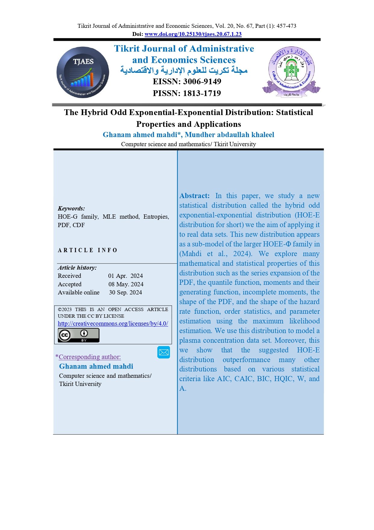 The Hybrid Odd Exponential-Exponential Distribution: Statistical Properties and ApplicationsAbstract views : 0 | PDF downloads : 0Page No.: 457-473 |