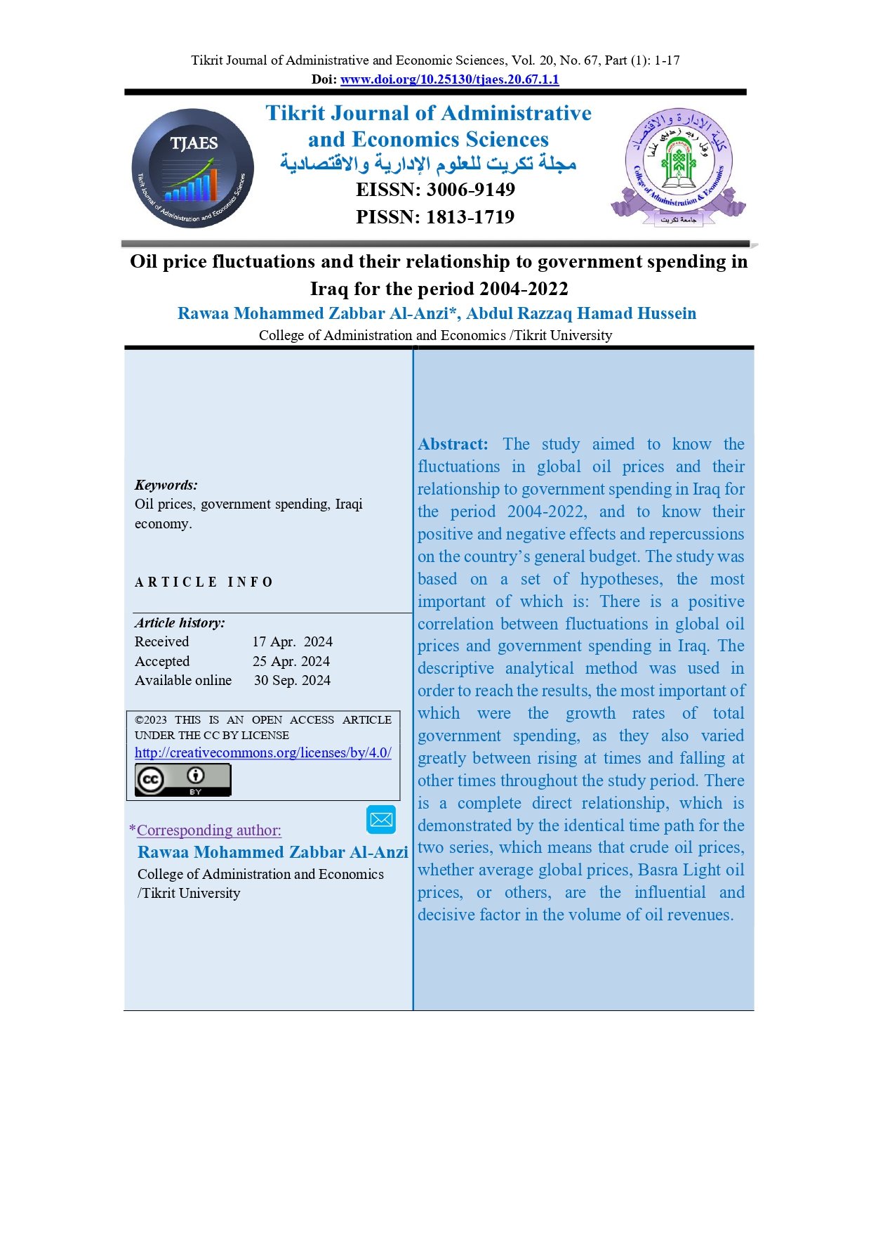 Oil price fluctuations and their relationship to government spending in Iraq for the period 2004-2022Abstract views : 0 | PDF downloads : 0Page No.: 1-17 |