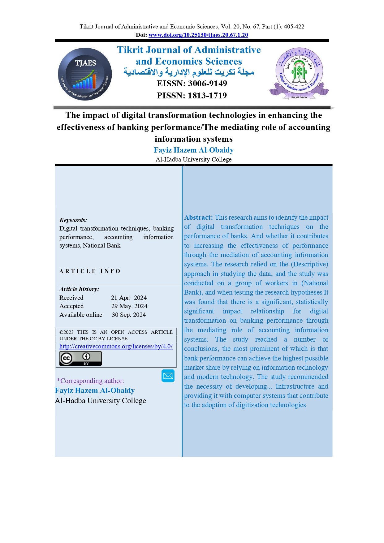 The impact of digital transformation technologies in enhancing the effectiveness of banking performance/The mediating role of accounting information systemsAbstract views : 0 | PDF downloads : 0Page No.: 405-422 |