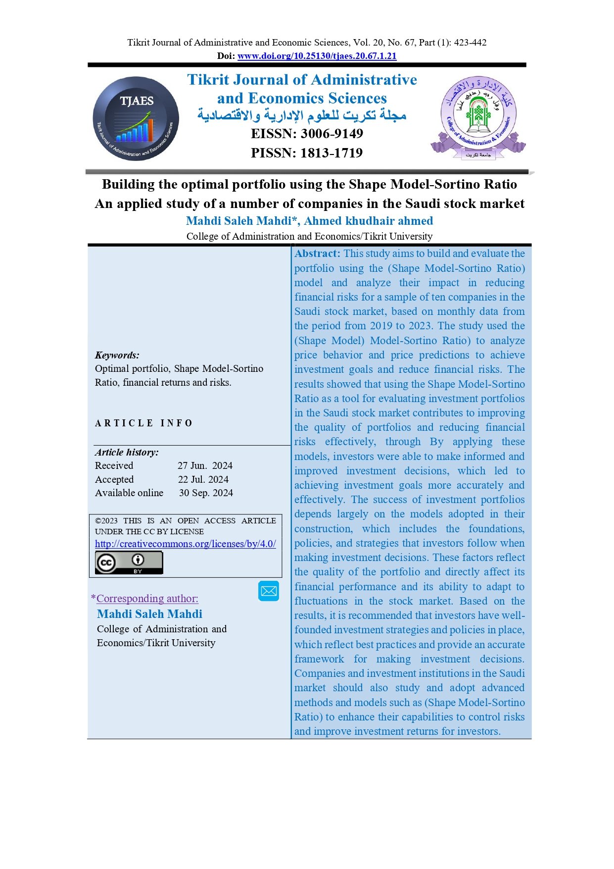 Building the optimal portfolio using the Shape Model-Sortino Ratio An applied study of a number of companies in the Saudi stock marketAbstract views : 0 | PDF downloads : 0Page No.: 423-442 |
